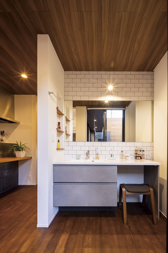 また、外部からの視線を遮るべく、中庭部分の壁の高さを調整し、カーテンの要らない生活を実現しました。外観の無機質な印象とは対照的に、キッチン部分にはコンクリート素材と木をふんだんに使い、シャープながら温かみのある空間とすることで、帰りたくなる我が家を実現しました。
