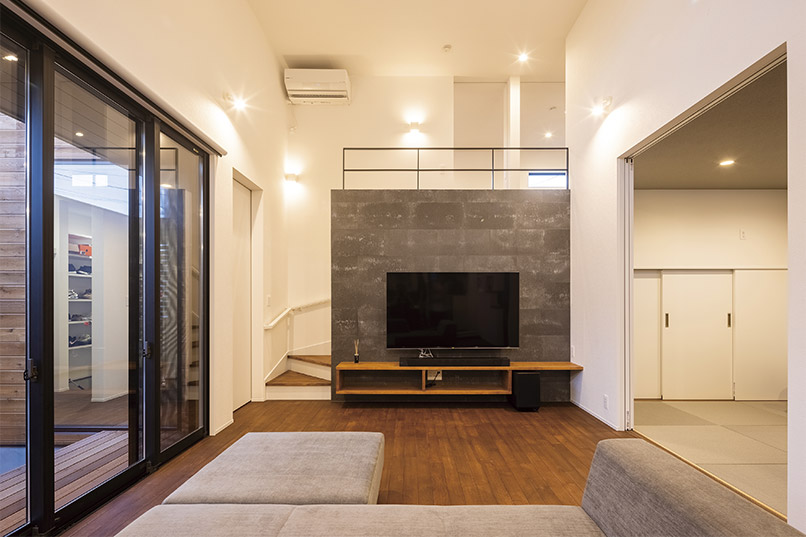厚みのある石張風の外壁とガルバリウムを使い、素材感の違いでインパクトのある外観に。内装も床材に無垢のアカシア、アクセントにコンクリート風の壁を使い、落ち着いた飽きのこないインテリアも印象的です。