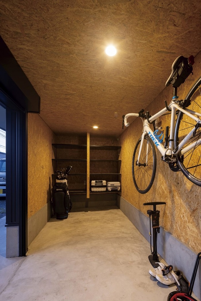 子供部屋のみを1階の部屋よりも高く配置し、その下を趣味のアウトドアスペースに。ロードバイクなどを収納できる土間としました。子供部屋からリビングを吹抜けにして開放感を演出すると同時に、階段を隠すことで2階建てであることを忘れるような空間に。