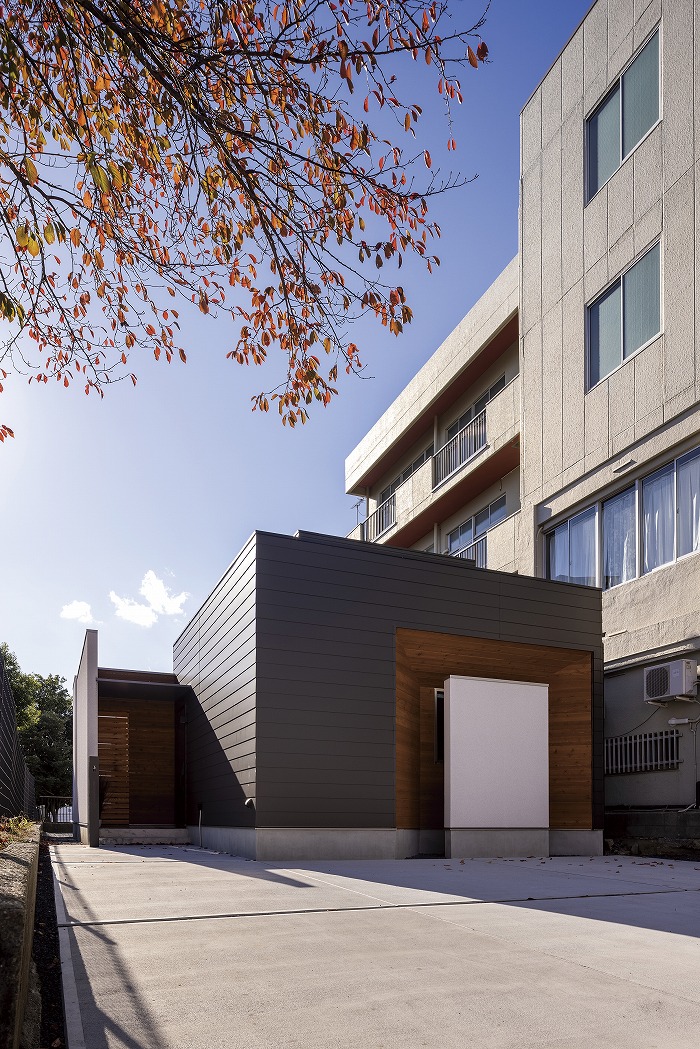 外壁は黒いガルバリウムをベースとし、無垢材のレッドシダーをアクセントに採用することで、どこか温もりを感じる外観に。夜間に光がもれる格子窓も建物にかわいらしい印象を与えてくれます。