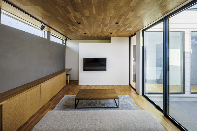 床と天井にはナラの無垢材を採用し、シックな佇まいの外観からは想像できない温かみのある室内となりました。家のどこにいても家族が繋がる、かけがえのない我が家です。