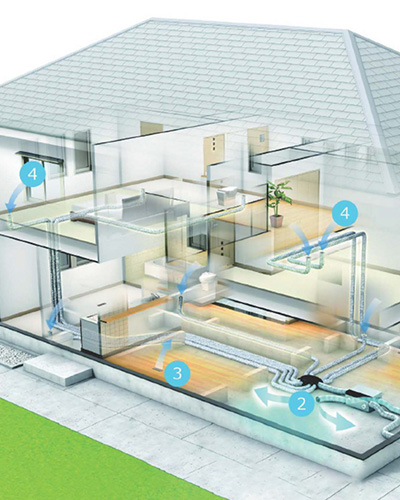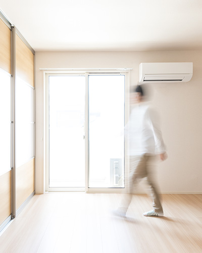 「澄家」は、機械で給気・排気を行う第一種換気。床下からきれいな空気を送り、ホコリが舞いにくく、温度差も少ない快適空間をつくります。花粉やPM2.5もカットでき、家族みんなにやさしい換気システムです。